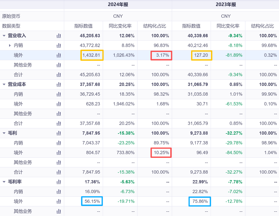 成果也直接反映在财报中:公司境外收入从2023年的127万元跃升至2024年的1433万元,毛利率更是分别高达75.86%、56.15%,显著高于公司整体20%左右的水平。尽管2024年境外收入占比仅3.17%,却贡献了10.25%的毛利,成为盈利结构优化的关键推力。