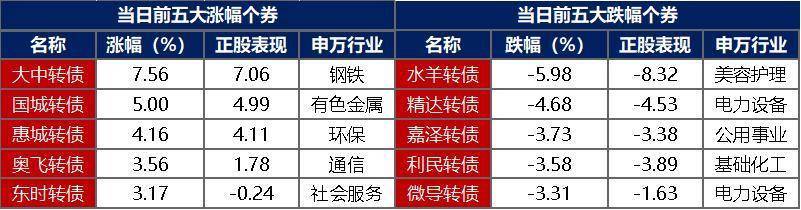 【转债市场主要指数集体跟跌】 11月20日,转债市场跟随权益市场有所下挫,当日中证转债、上证转债、深证转债分别收跌0.23%、0.27%、0.23%。当日,转债市场成交额635.15亿元,较前一交易日缩量23.50亿元。转债市场个券多数下跌,399支转债中,145支收涨,246支下跌,8支持平。当日上涨个券中,大中转债涨超7%,国城转债涨超5%;下跌个券中,水羊转债跌逾5%,精达转债跌逾4%。