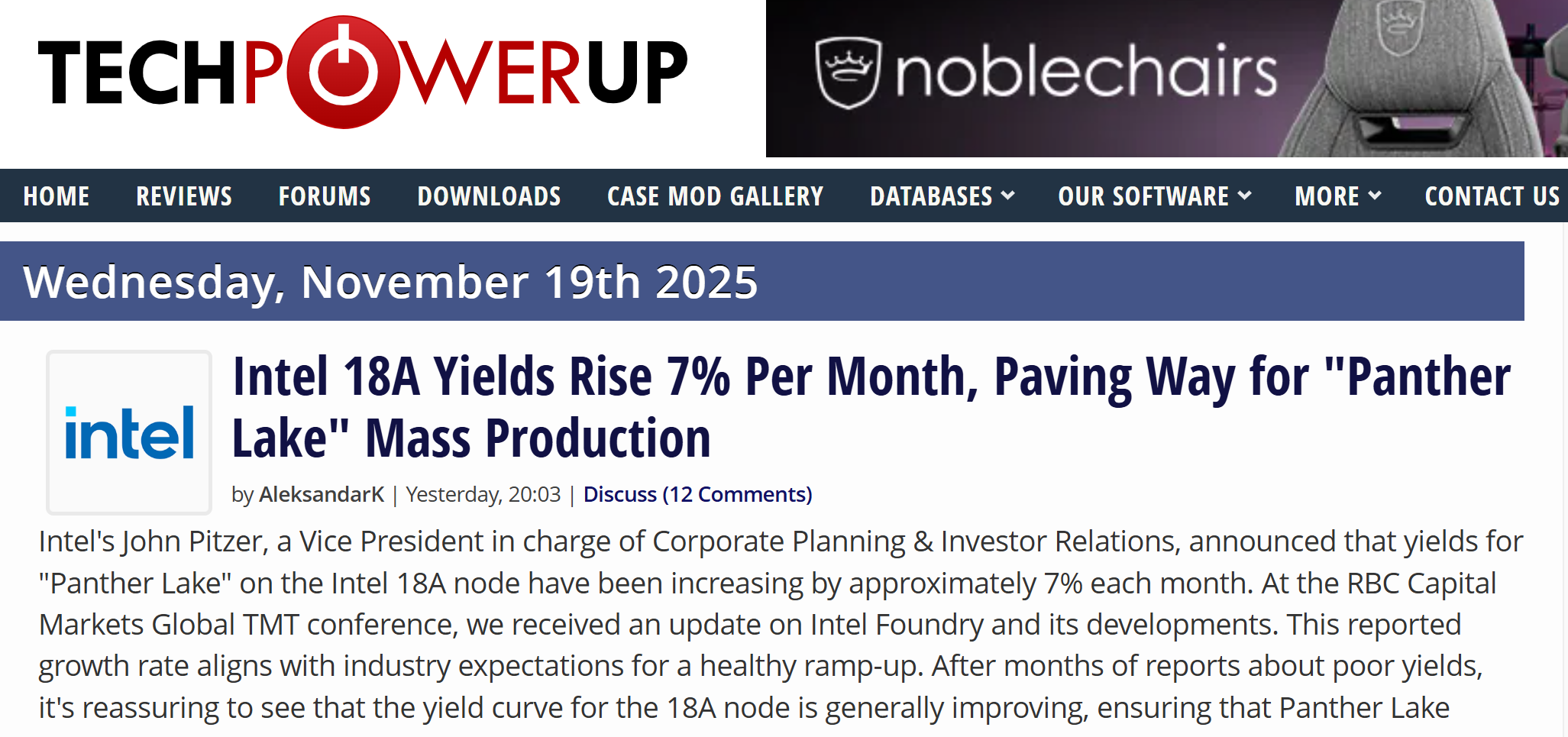 据介绍,若延续过去7至8个月的良率提升曲线,英特尔有望在不增加单芯片成本的前提下,逐步扩大“Panther Lake”处理器的产能规模,为后续批量生产奠定基础。约翰·皮策表示,英特尔已找到可预测的良率提升路径,对本季度推出的相关新品充满信心,并计划在2026年1月举办的CES展会上公布更多技术与产品详情。