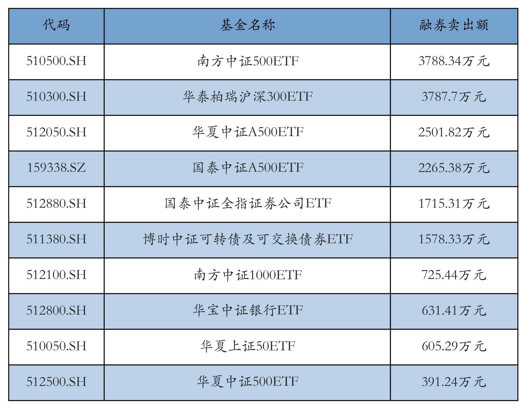 11月20日ETF融券卖出额前三位分别为:南方中证500ETF(3788.34万元)、华泰柏瑞沪深300ETF(3787.7万元)和华夏中证A500ETF(2501.82万元),前10具体见下表: