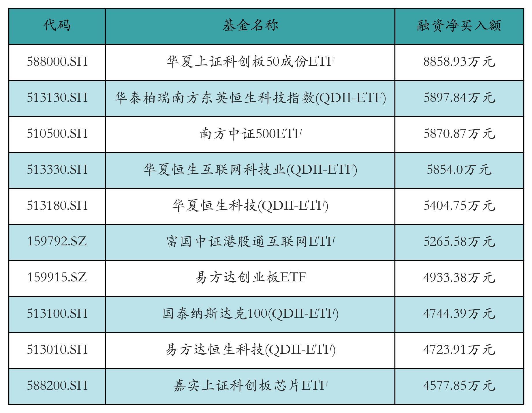 11月20日ETF融资净买入额前三位分别为:华夏上证科创板50成份ETF(8858.93万元)、华泰柏瑞南方东英恒生科技指数(QDII-ETF)(5897.84万元)和南方中证500ETF(5870.87万元),前10具体见下表: