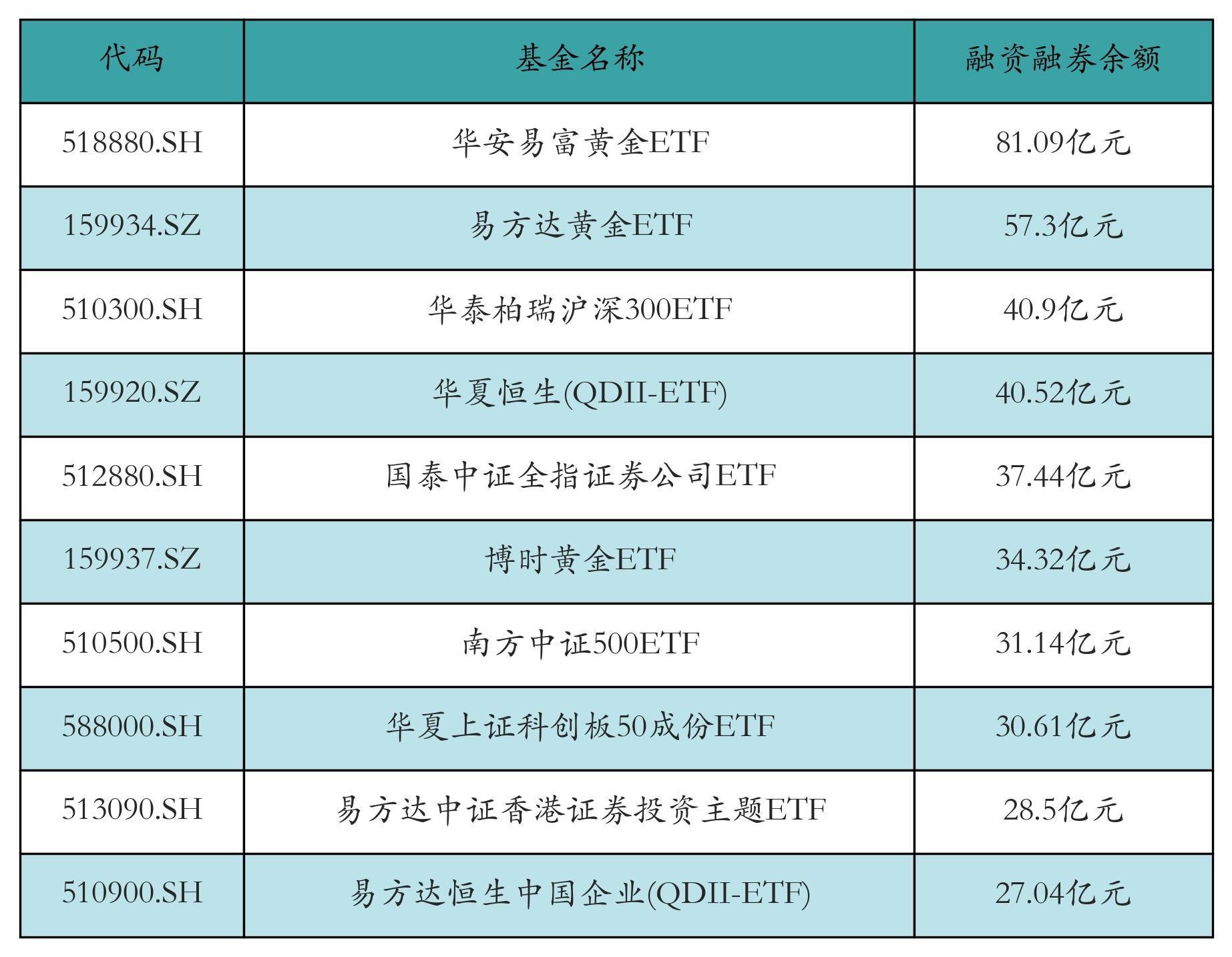 11月20日ETF两融余额前三位分别为:华安易富黄金ETF(81.09亿元)、易方达黄金ETF(57.3亿元)和华泰柏瑞沪深300ETF(40.9亿元),前10具体见下表: