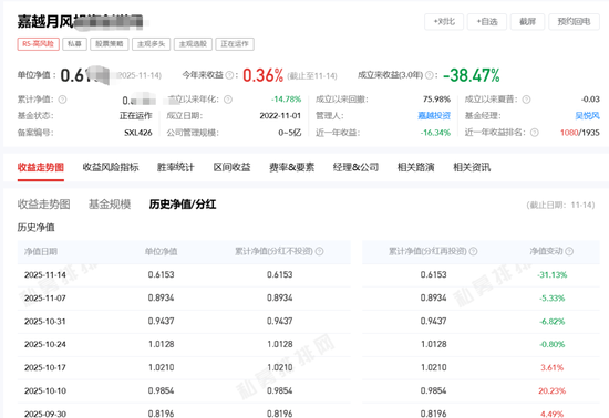 11月17日,私募圈在度上演惊天大瓜。知名网红私募月风旗下产品,嘉越月风系列产品再度暴跌,一周净值跌了31%,最新净值只有0.6153。而这距离其净值上岸还不足1个月。