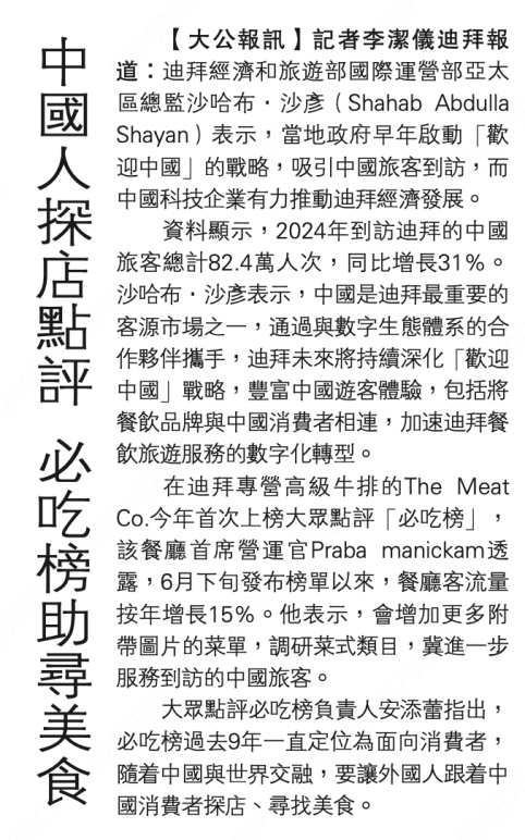 位于迪拜的高级牛排餐厅The Meat Co.今年首次上榜,其首席营运官Praba manickam透露,自6月下旬发布榜单以来,餐厅客流量同比增长15%。“我们正在增加更多附带图片的菜单,调研菜式类目,希望能更好地服务中国旅客。”这家餐厅的经历正是“必吃榜”促进跨文化餐饮交流的一个缩影。