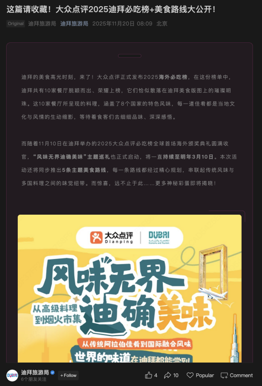 目前,迪拜经济和旅游部与美团已在发布会当日签署战略合作备忘录,双方将强化在餐饮、酒店、景点及多元旅游场景的合作。这种深度合作模式预示着“必吃榜”正在从单纯的美食榜单,升级为连接中国消费者与全球餐饮市场的重要桥梁。