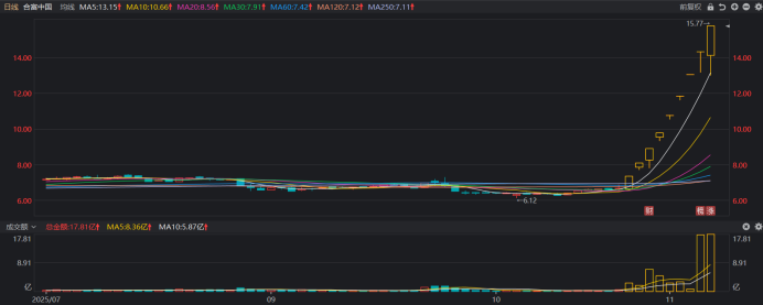 今日(11月7日),市场热股合富中国再获涨停,截至收盘,其成功晋级9连板,成为目前除ST股外的最高连板高标。同时,其今日股价创2022年4月以来近3年半新高,年内涨幅扩大至129.2%。