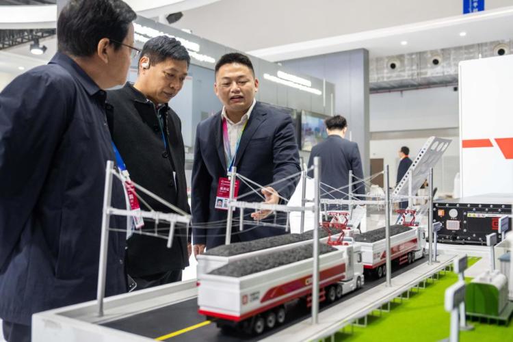 11月7日,在株洲国际会展中心,工作人员(左三)向观众介绍电气化道路运输系统。新华社记者 陈思汗 摄